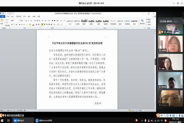 會議開始,姜玖林同志為大家朗讀回信的內容,并結合時事詳細解讀。隨后,黨支部蘇亞麗、姚康樂等五名同志就學習相關精神后的思考與感悟做個人發言。蘇亞麗同志談到:“雖然因為疫情隔離在家,但只要懷著同樣的心境與情懷,就可以肩負起時代賦予我們的使命。”王藜諾同志說道:“我們要繼續發揮黨員的帶頭模范作用,用行動展現青年黨員的品質和擔當。”最后,由李民老師做總結,他提到:“疫情當前,也要嚴格認真的做好每一次支部活動,這不僅是對大家意志和品質的考驗,也是中國精神和中國力量的集中體現,希望大家克服困難,不斷提高思想覺悟,不斷提升綜合能力,為實現自己的目標不斷努力奮斗,為黨建事業貢獻自己的一份力量。”
