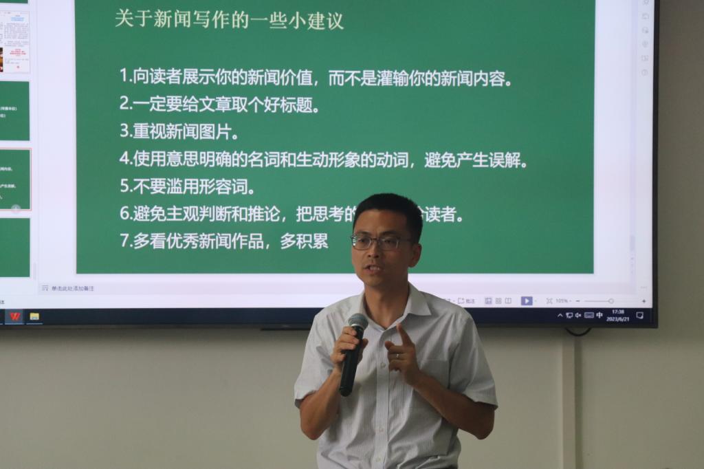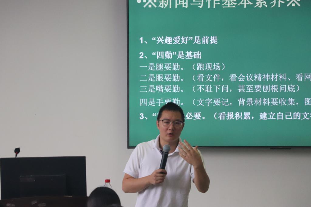 培訓(xùn)會(huì)上,黃國(guó)兵以《新媒體環(huán)境下新聞寫作與表達(dá)》為題,圍繞什么是新聞、怎樣寫好新聞稿、怎樣寫好社會(huì)實(shí)踐新聞稿等三個(gè)部分展開具體講述。講述了自己社會(huì)實(shí)踐的經(jīng)歷,提出社會(huì)實(shí)踐中可能會(huì)遇到的問(wèn)題,并詳細(xì)講授了社會(huì)實(shí)踐新聞撰寫的相關(guān)知識(shí)與技巧。他認(rèn)為,在如今新媒體環(huán)境下,大眾對(duì)新聞的需求發(fā)生了變化,新聞寫作也要不斷適應(yīng)時(shí)代需求。他以翔實(shí)的案例、生動(dòng)的語(yǔ)言從新聞六要素到導(dǎo)語(yǔ)的編寫,從軟新聞到標(biāo)題的命名等方面進(jìn)行了詳細(xì)闡述。