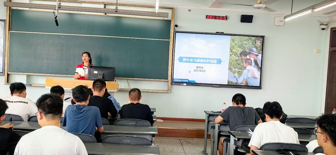 由校醫院、紅十字會資深專家廖香瓊醫生,針對本次實習所在地的天氣和地理情況,詳細講解了野外實習過程中可能的安全隱患及預防措施,比如中暑的癥狀及應急處理、蚊蟲(蜱蟲,隱翅蟲等)叮咬的預防和處理、預防中毒和過敏等情況下的處理措施等,此外,還重點介紹了野外受傷、出血、骨折等意外創傷的包扎和應急處理方法,并特別提醒同學們野外工作要穿長褲長袖衣服,切實注意野外工作的安全,最大程度避免意外情況的發生。