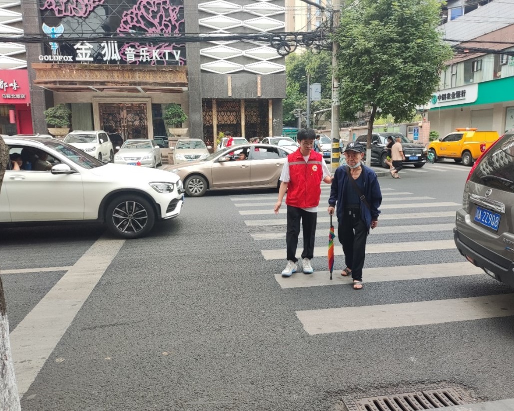 志愿者們井然有序地進行著志愿服務工作,此時,一位年邁的老人緩慢地行走在人行道上,志愿者尹一琨立刻沖上前去幫助老人走過人行道,并向來往車輛示意減速。事后,社區工作人員對志愿者的行為進行了鼓勵和肯定。