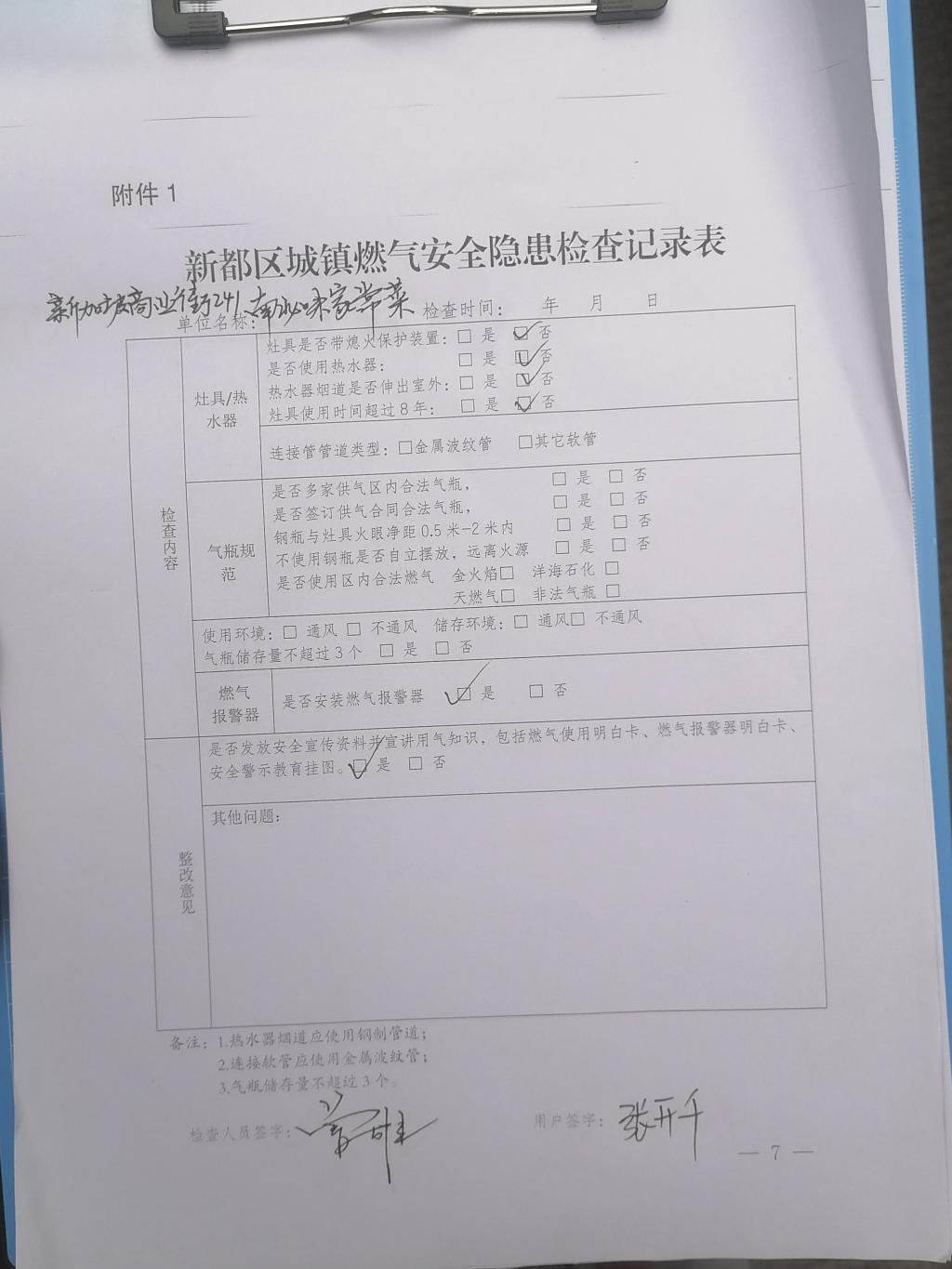 隨后,志愿者們對社區(qū)的每一戶和商家的燃氣管道,燃氣灶等設施進行細致的檢查,確保完全安全,并向社區(qū)公民展示燃氣安全隱患檢查的各個要點,充當自家燃氣安全的“第一保護員”,并配合志愿者們進行燃氣安全隱患記錄簽字,保證此次活動的真實性和可靠性。