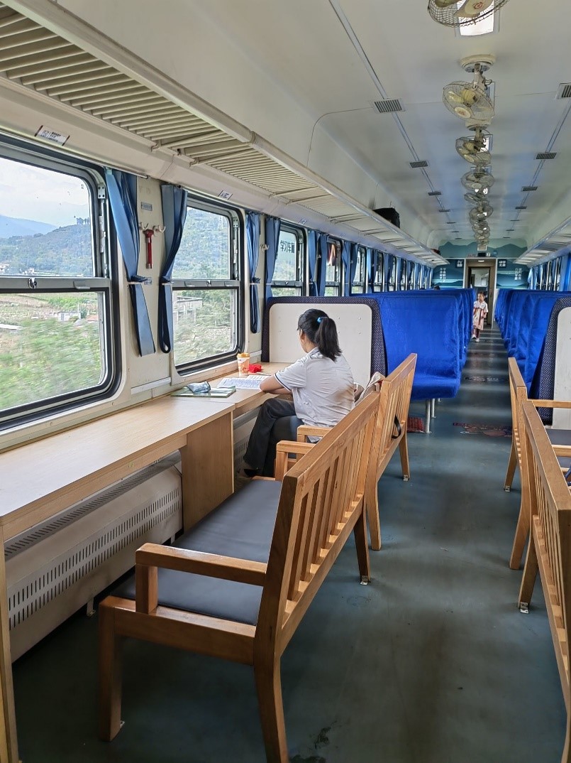 列車長(zhǎng)王明劍是米易人,工作前就經(jīng)常坐這輛車,“之前學(xué)生們要是想寫作業(yè)只能在狹窄的小桌板上,為了給他們提供便利,我們鐵路部門專門設(shè)立了這節(jié)車廂。”
