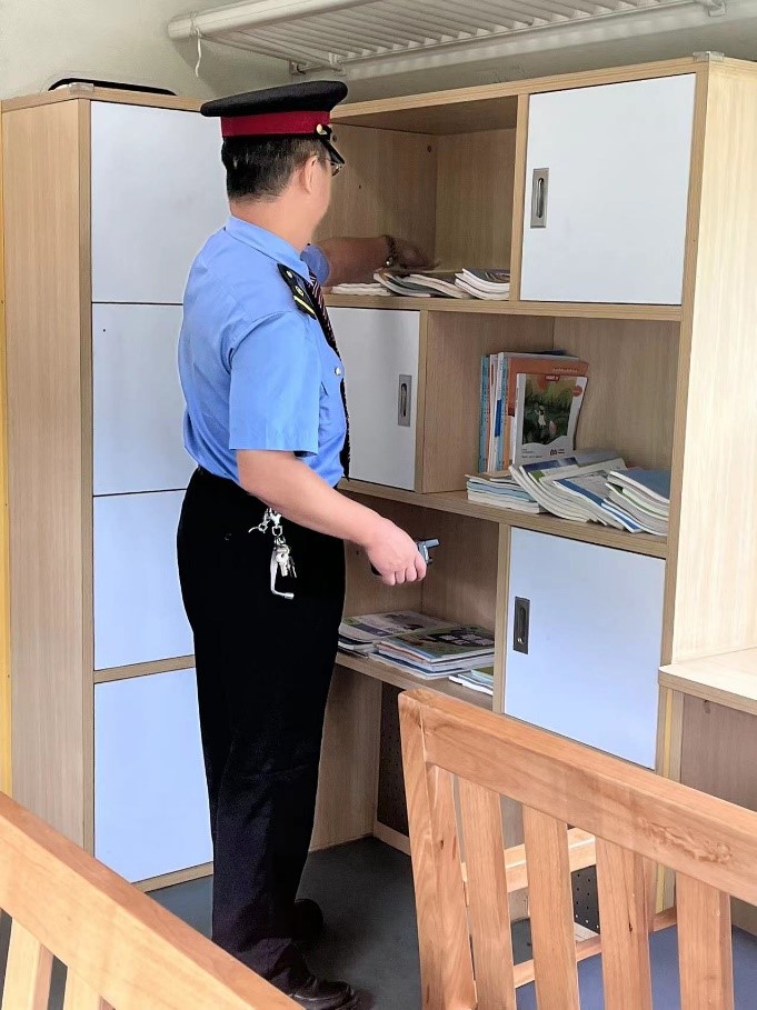 列車設(shè)有特色車廂,進(jìn)入學(xué)習(xí)車廂——3號(hào)車廂,很快就能發(fā)現(xiàn)它與其他列車的不同之處。四張長(zhǎng)桌,四把長(zhǎng)椅,兩個(gè)書柜,一個(gè)來(lái)自鹽邊縣的初二小姑娘正坐在桌邊寫作業(yè)。走近書柜,各年級(jí)各學(xué)科的書應(yīng)有盡有,其中不乏彝文書籍。
