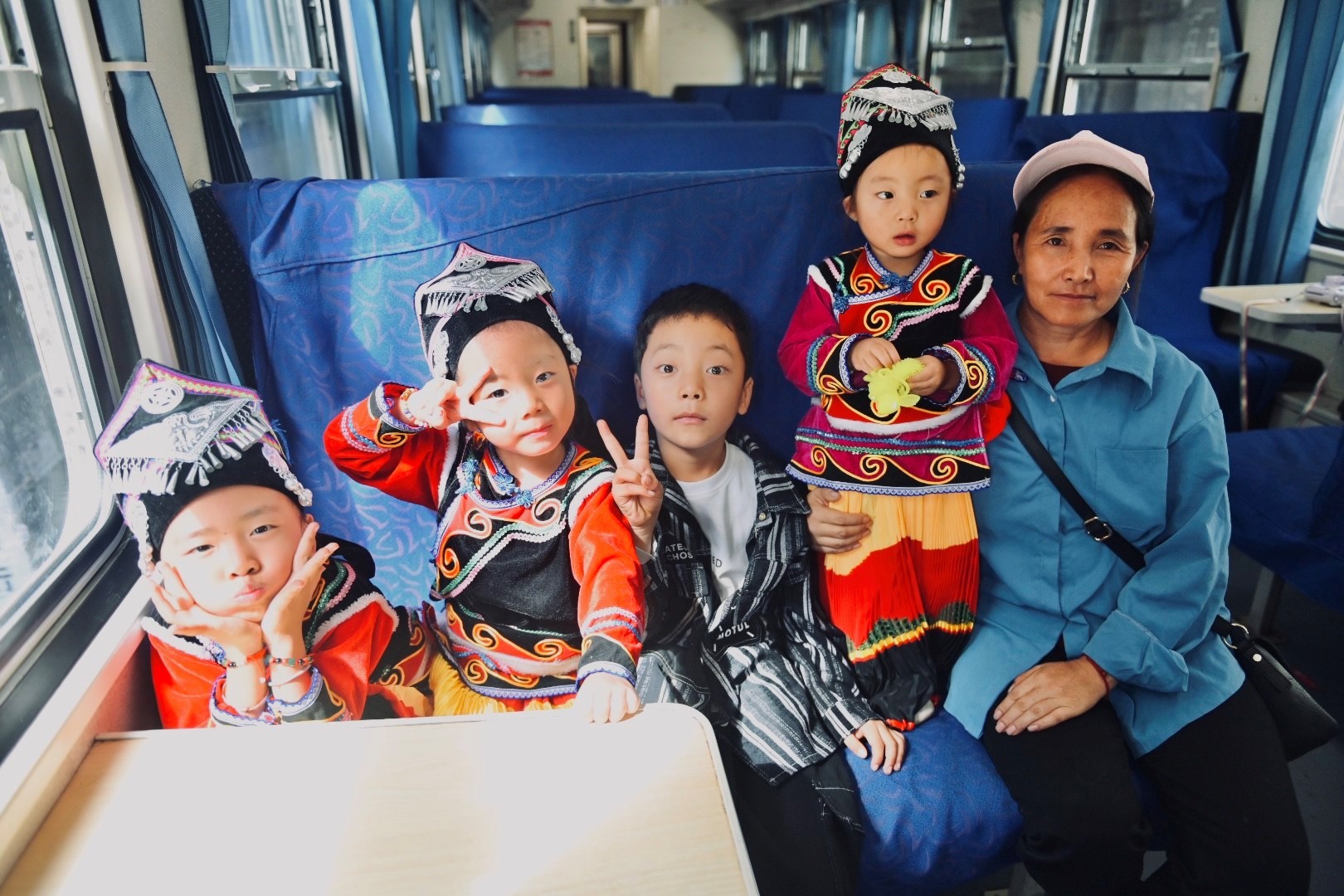 順著車廂過(guò)道繼續(xù)往前走,隊(duì)員們遇到了瓦爾五加莫奶奶和幾個(gè)身穿彝族服飾的小朋友。四個(gè)娃娃吃涼粉吃得津津有味,奶奶在旁邊慈愛地看著他們。