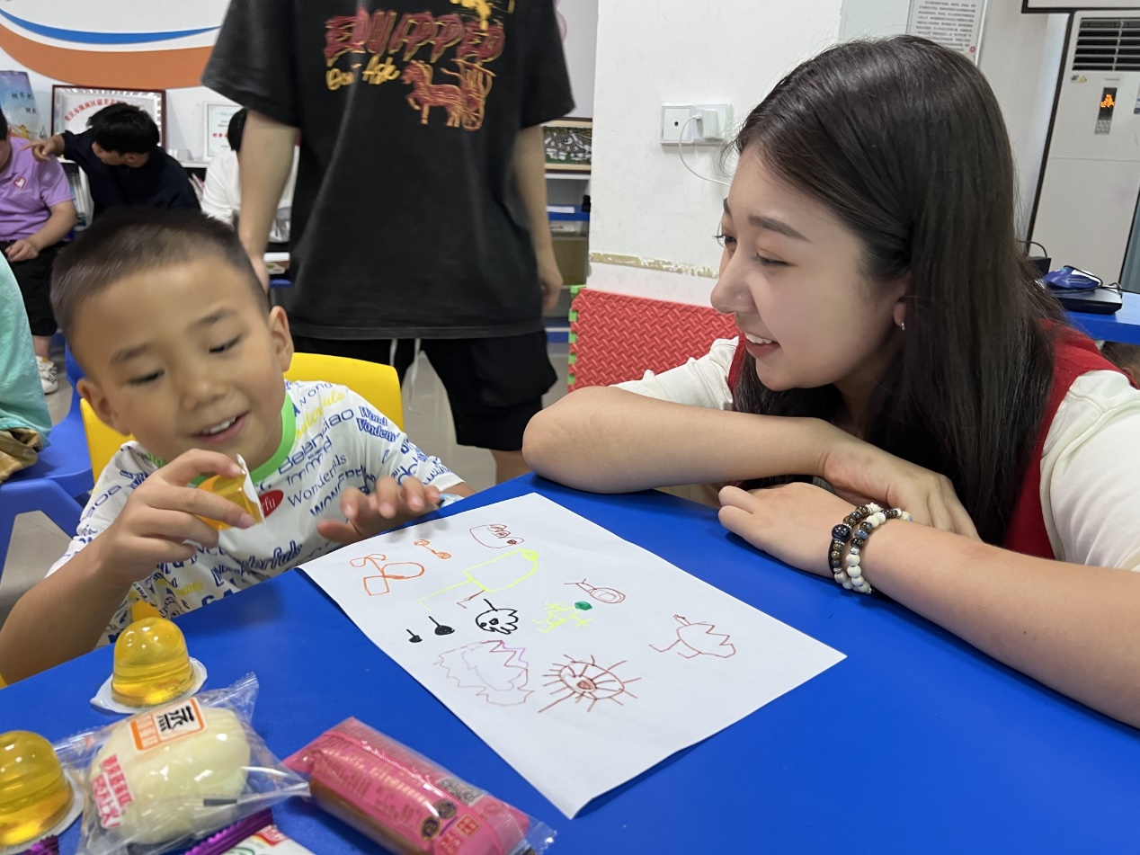 一間教室里突然傳出了歡樂的笑聲,這其中不僅僅是小朋友們純真的笑,還包括了一群千里迢迢從四面八方來到這里的志愿者。孩子們得意地捧著自己的“大作”,仿佛在宣布自己的勝利;志愿者們也為自己的努力感到高興,與小朋友比起了愛心。