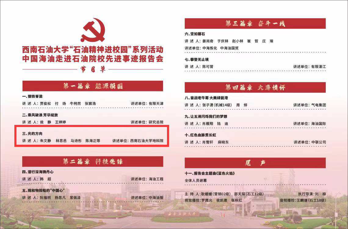 報告會中,地科院學生表演了原創情景朗誦詩歌《光的方向》。作品以地質學家李四光先生的生平經歷為背景進行再創作,展現了新一代地質人的精神面貌,表達了西南石大青年學子到祖國最需要的地方建功立業的遠大理想,以及勇于為端牢能源飯碗貢獻智慧和力量的擔當。