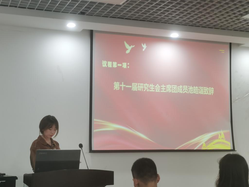 在向百忙之中出席會議的王晨晨老師表示感謝與歡迎后,黎文杰主席宣布,地科院第十一屆研究生會第一次全體大會正式開始。首先,第十一屆研究生會主席團成員池皓詣上臺致辭,她向全體參會同學講述了自己在研究生會工作的一年中取得的經驗與感悟,并提出各部門間團結合作、攜手并進是研會持續提供高質量服務的重要途徑。緊接著,主席團成員黎文杰代表第十一屆研究生會作介紹報告。他將研究生會的組成結構、主要職責及未來展望系統、詳盡地鋪陳開來。在此基礎上,研究生會各部門正(副)部長也就部門工作作述職匯報。會議的最后,王晨晨老師針對本次大會的匯報內容作總結講話。
