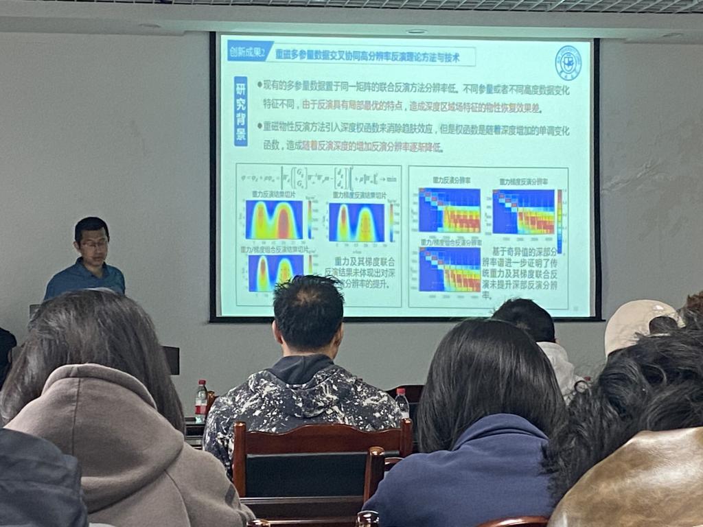 本次講座以《航空重磁多參量梯度數據反演技術及物性結構透視》為題。報告主要圍繞以下幾個問題展開:1、航空重磁多參量梯度探測技術產生背景;2、重磁多參量梯度數據反演難點;3、重磁物性反演分辨率提升的新思路;4、物性反演效率提升的函數擬合計算新方法。講座中馬國慶教授提出:現有的多參量數據置于同一矩陣的聯合反演方法分辨率低。不同參量或者不同高度數據變化特征不同,由于反演具有局部最優的特點,造成深度區域場的物性恢復效果差;重磁物性反演方法引入深度權函數來消除趨膚效應,但是權函數是隨著深度增加的單調變化函數,造成隨著反演深度的增加反演分辨率逐漸降低。最后,馬國慶教授與同學們一起交流探討,并解答了同學們提出的相關問題。