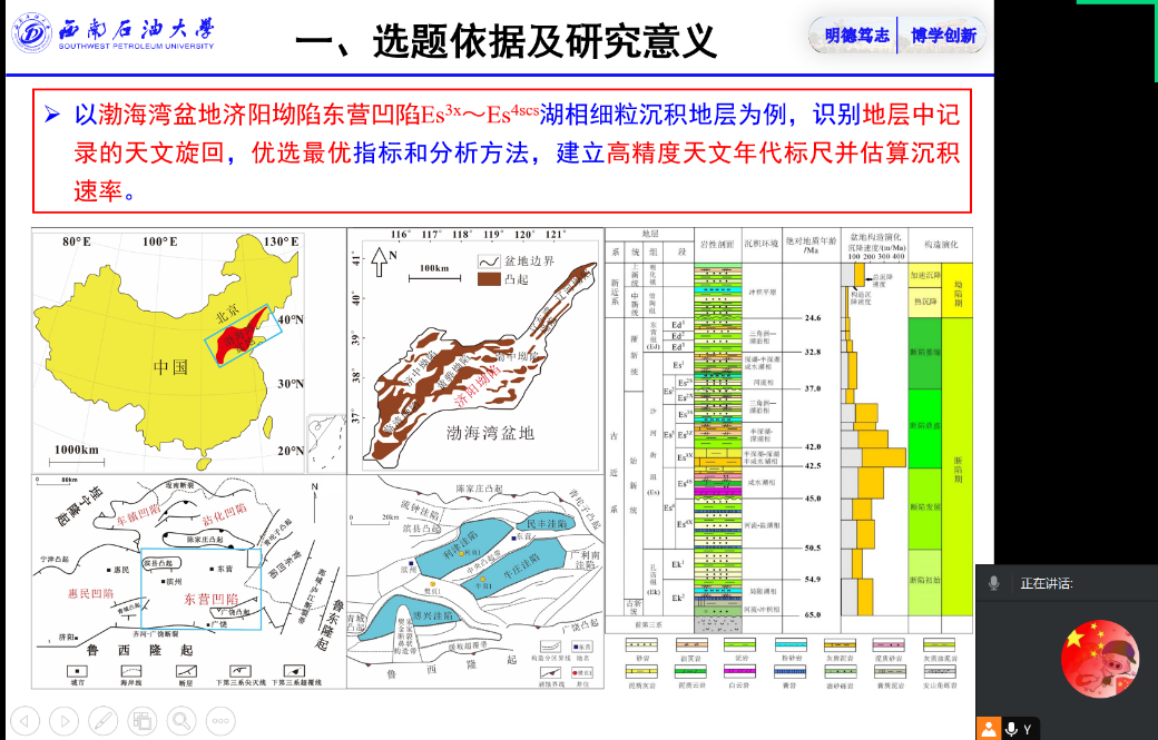 緊接著于樂丹博士為同學們帶來第二場講座。以陸相湖盆中細粒沉積地層廣泛發育的東營凹陷Es3x~Es4scs為例,在計算了古近紀時期地球軌道要素偏心率、斜率和歲差周期的基礎上,對不同沉積序列替代性指標和時間序列分析方法進行了優選,最終確定出最優的指標為地球物理參數數據,最優的方法為TSAM1,并依據最優的方法和指標建立研究區高精度天文年代標尺估算了沉積速率。