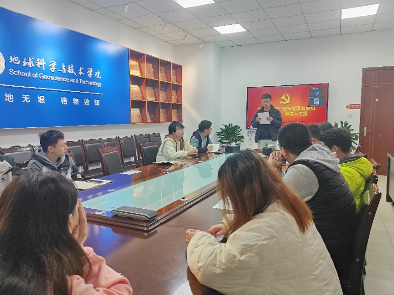 2023年11月15日下午,地科院碩士2022級第二黨支部于明辨樓A302召開支部會議,討論吸收朱采薇等三名同志為中共預備黨員的相關事宜。本次會議由支部副書記顧天甫同志主持,本支部全體黨員、發展對象參會。本次會議嚴格按照黨組織接收預備黨員各項程序進行。