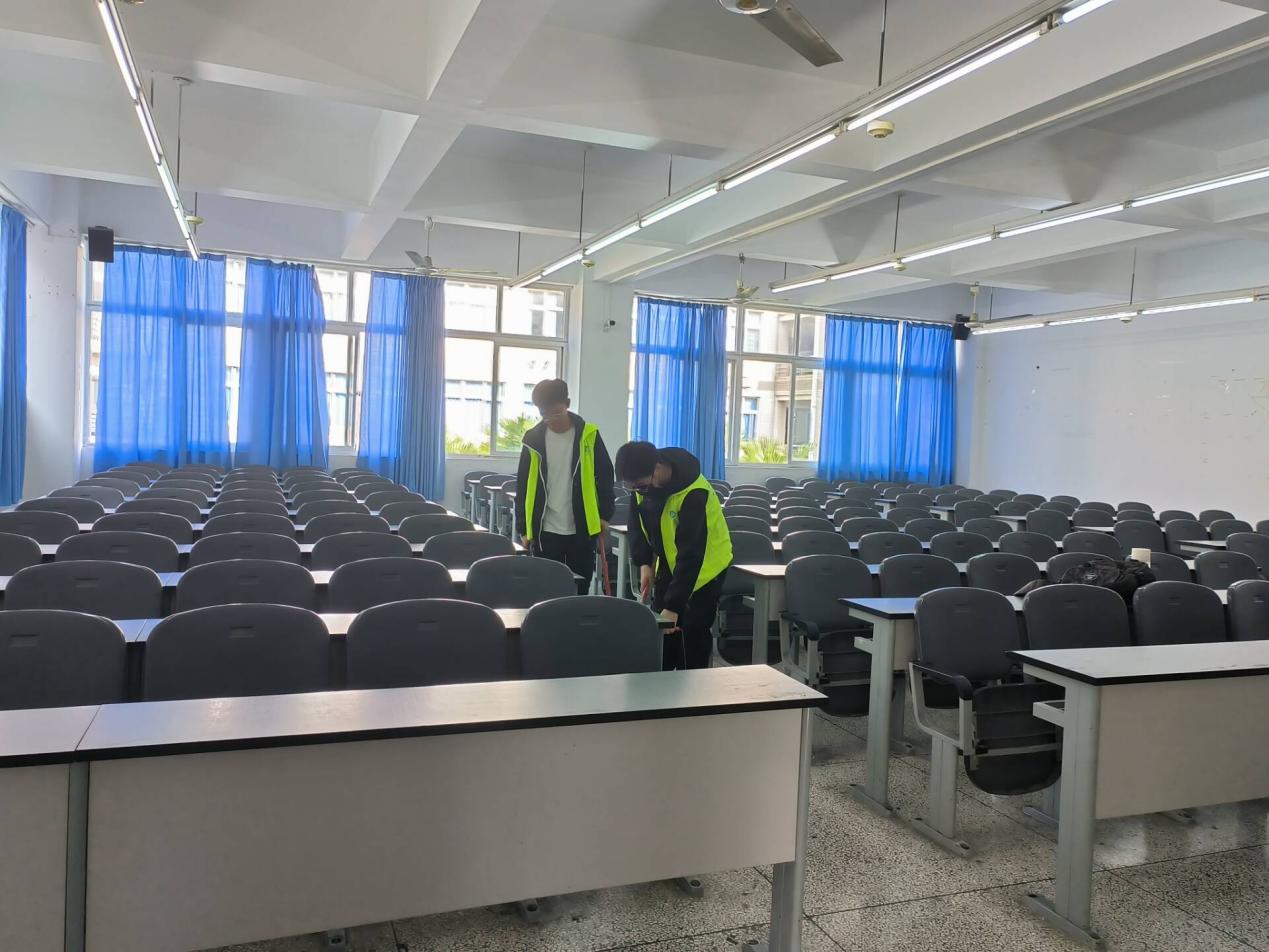 在秋的尾巴里,志愿者們熱情洋溢地來到思學(xué)樓,于活動(dòng)開始前在思學(xué)樓A區(qū)大廳有序集合,經(jīng)工作分配,他們身著統(tǒng)一服裝,手握清潔工具,開始了一場緊張而有序的清掃行動(dòng)?;顒?dòng)過程中,志愿者們逐層清掃,每一間教室都有他們辛勤勞動(dòng)的身影。他們手持掃帚和簸箕,仔細(xì)搜尋,認(rèn)真清掃,不放過教室和走廊的每一個(gè)角落。他們的付出旨在為全體師生打造一個(gè)更加潔凈、舒適的思學(xué)環(huán)境。身著綠色馬甲的志愿者們象征著地科學(xué)子積極勞動(dòng),樂于助人的精神風(fēng)貌,他們的行動(dòng)讓思學(xué)樓煥然一新,為在地科院學(xué)習(xí)的學(xué)子們提供了一個(gè)更加安靜、整潔的學(xué)習(xí)環(huán)境。