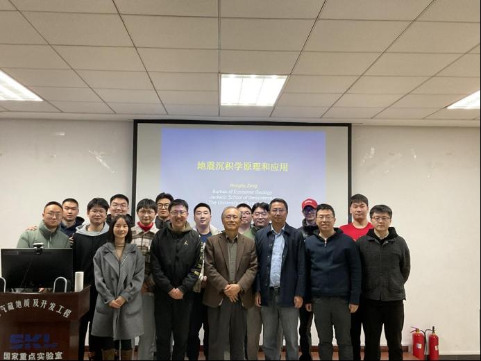 本次講座以《地震沉積學(xué)原理和應(yīng)用》為題,從地震沉積學(xué)的原理和地震沉積學(xué)歷年實(shí)際應(yīng)用兩方面深度闡述了地震沉積學(xué)在國際范圍內(nèi)的發(fā)展和應(yīng)用模式。曾教授提出了地震沉積學(xué)是以現(xiàn)代沉積學(xué)和地球物理學(xué)為理論基礎(chǔ),利用三維地震資料,經(jīng)過層序地層、地震屬性分析和地層切片,研究地層巖石宏觀特征、沉積結(jié)構(gòu)、沉積體系、沉積相平面展布以及沉積發(fā)育史的地質(zhì)學(xué)科這一概念;解釋了地震巖石學(xué)的相關(guān)理論,其是指調(diào)整地震資料使地震波同相軸可以像測(cè)井資料一樣解釋地層巖性,地震巖石學(xué)研究要求把三維地震數(shù)據(jù)體轉(zhuǎn)化成測(cè)井巖性體,在巖性體里將GR和SP測(cè)井曲線反映巖性的測(cè)井曲線和臨近的地震反射進(jìn)行結(jié)合可以更好地從地震資料上判斷圈閉。曾洪流教授將地層切片技術(shù)應(yīng)用于河道(路易斯安那州上新統(tǒng))、河控三角洲(密西西比三角洲)、海底扇(墨西哥灣)滑塌體和海地峽谷(路易斯安那州陸坡和海地峽谷)的識(shí)別和描述,取得良好的應(yīng)用效果。