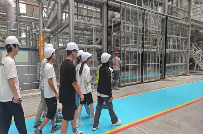在紙張烘干車間,同學(xué)們從講解員那里了解了中順潔柔的30萬噸漿紙一體化項(xiàng)目,企業(yè)秉承“綠水青山就是金山銀山”的理念,堅(jiān)持人與自然和諧共生。在紙張生產(chǎn)車間內(nèi),成員們能夠明顯地感受到溫度的變化,車間內(nèi)氣溫適中,少數(shù)工人簡單操作著機(jī)器便可高效率地完成大批紙張的生產(chǎn),這不禁讓大家感嘆科技帶來的便利和巨大變革。