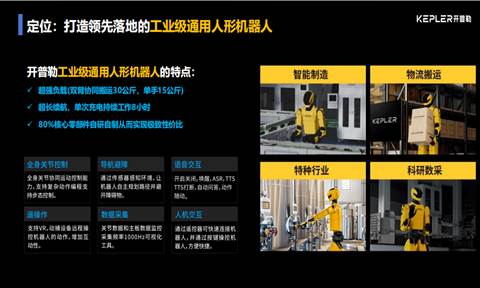 開普勒機器人以“類人形態適配工業場景”為核心設計理念,構建兼具力量與靈巧的產品外形,具備AI識圖、雙臂協調搬運等滿足多種工業生產場景任務需求的功能。產品K2“大黃蜂”采用175cm身高、75kg體重的全尺寸人形結構,全身配置52個關節自由度,其中單腿關節自由度實現穩健步態調節,靈巧手11個自由度保障靈活抓取物品。產品結構設計使其靈活穿梭于生產線貨架、設備間隙,替代人類完成工業生產貨物搬運等繁重工作。