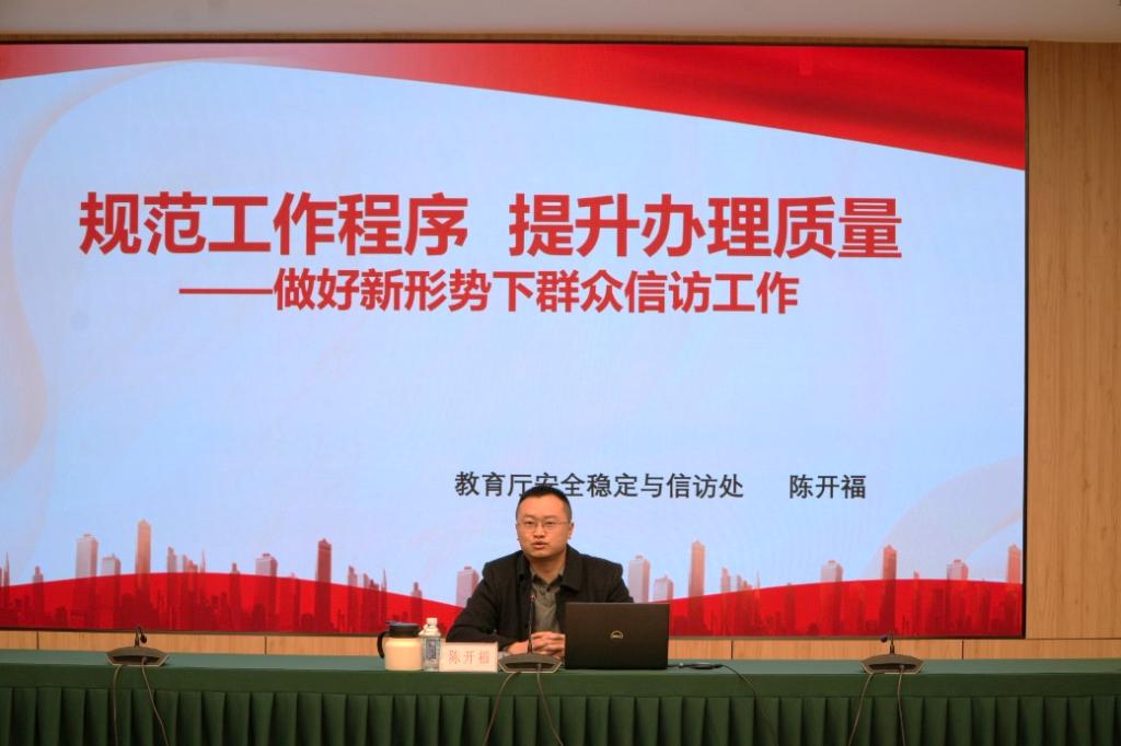 為進一步提升學校信訪工作科學化、規范化、法治化水平,在12月4日舉行的2024年第4期辦公室業務講堂上,四川省教育廳安全穩定與信訪處二級主任科員陳開福受邀為學校相關部門負責人、科室長代表,學院黨委副書記、輔導員代表作了題為《規范工作程序 提升辦理質量--做好新形勢下群眾信訪工作》的報告。