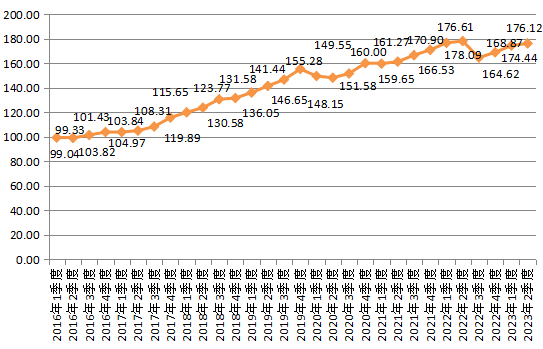2023年2季度天然氣銷售公司景氣指數為176.12,處于景氣狀態(tài)。本季度與2023年1季度相比有微幅上升,景氣變動系數為1.010。其中,供求狀態(tài)較上季度有小幅下降,就業(yè)人員、價格變化較上季度微幅下降,員工收入、經營狀況較上季度有微幅上升,產品銷量較上季度有小幅上升。詳見圖4及表1。