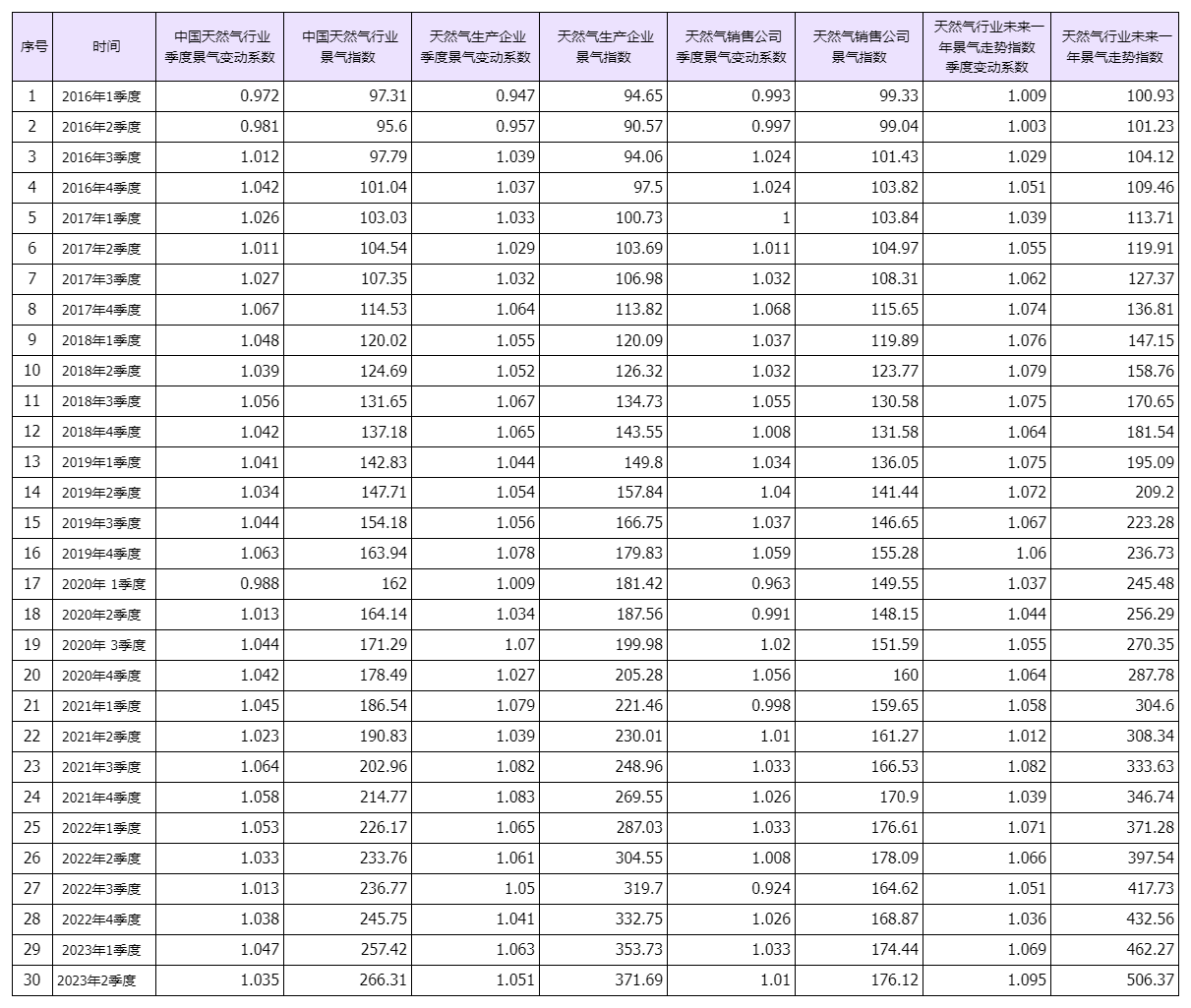 表1 天然氣行業(yè)景氣指數統(tǒng)計表