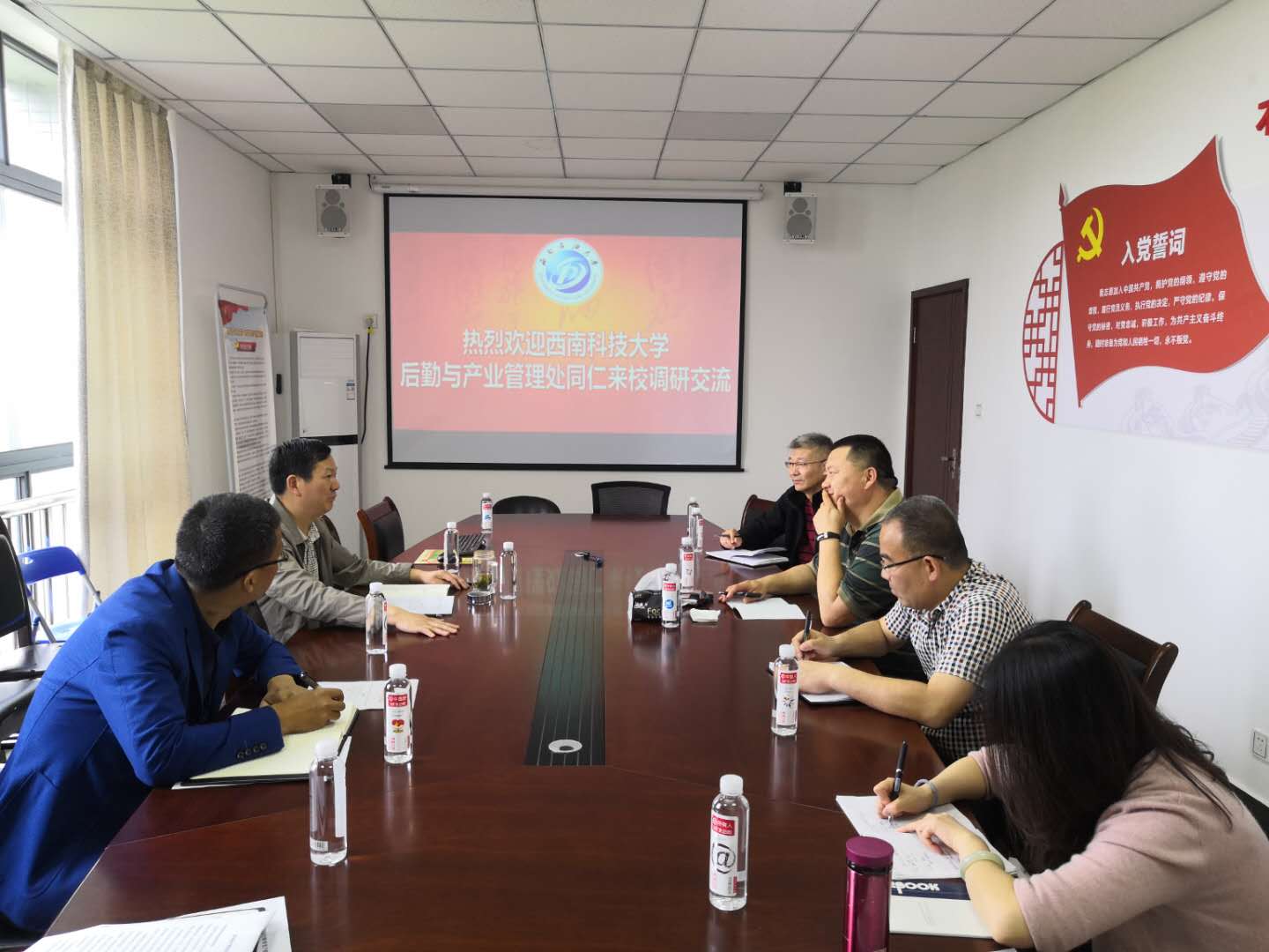 4月17日下午,西南科技大學后勤與產業管理處處長張克武一行4人到國資處調研后勤托管工作,調研會由國資處處長彭尚源主持。