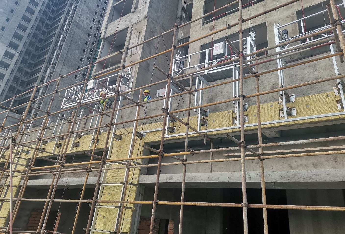 明德博創(chuàng)公司負責人介紹了項目施工情況:內(nèi)外墻抹灰除7、8號樓已全部完成;部分樓棟已完成第一遍內(nèi)墻膩子施工;商鋪幕墻預埋板已安裝完成;外墻一體板用吊籃全部通過驗收,一體板材料部分已進場,預計下周開始一體板安裝施工;室內(nèi)給排水、電力橋架等安裝工程按計劃進行。