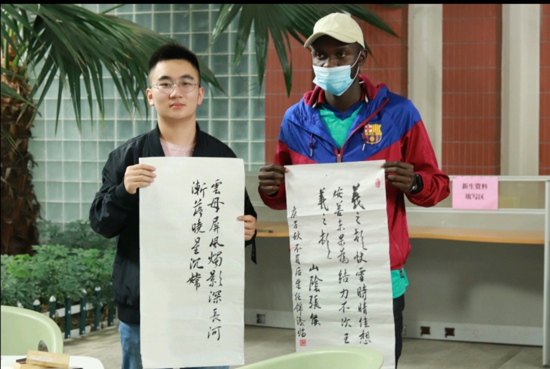 圖 學生展示書法作品 活動最后,中外學生齊聚一堂,學習制作月餅,感受美食中的團圓與文化的傳承。