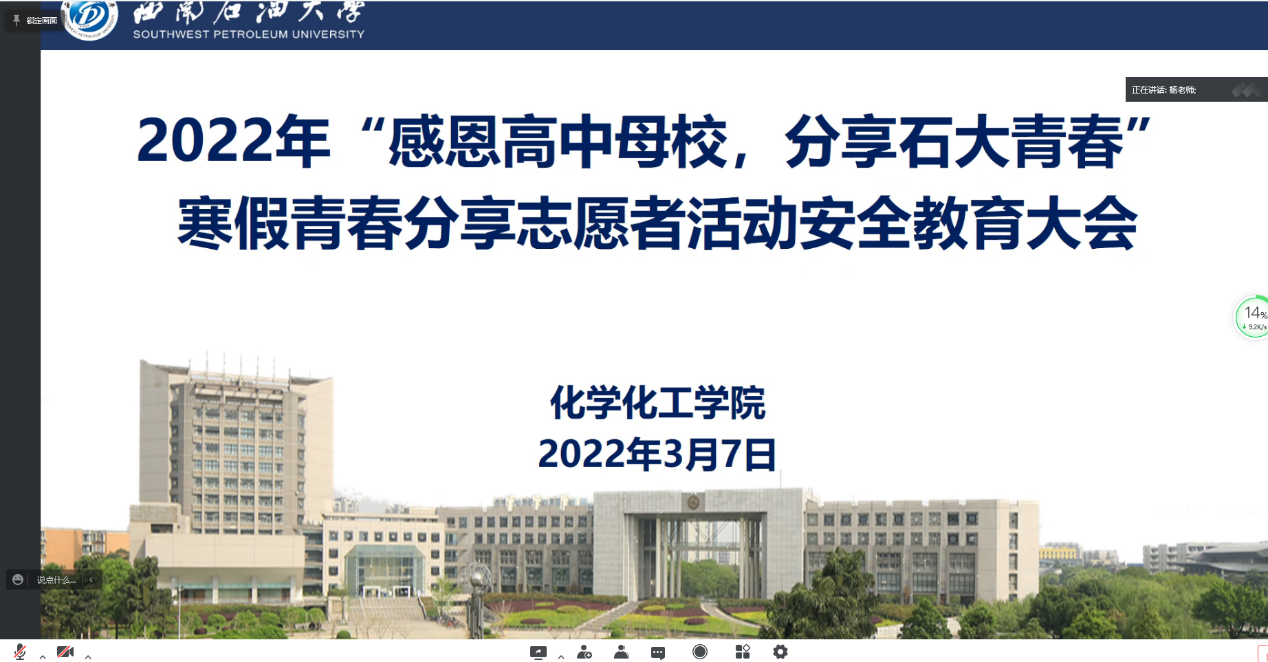 為進一步增強學生校外實踐防疫及安全意識,12月25日,化工院開展2022年“感恩高中母校,分享石大青春”寒假青春分享志愿者活動線上安全教育培訓大會。 學院輔導員、招生宣傳工作聯系人楊磊對通過初審的同學表示祝賀,接著,他圍繞安全教育、專業介紹兩模塊進行講解。他強調,后續一切行程安排以學校官方通知為準,不得擅自行動,在實踐過程中所有隊員要注意生命安全、財產安全和人身安全,遵守當地疫情防控政策,時刻緊繃人身安全和疫情防控底線。 楊磊對學院五大本科專業相關知識進行講解,同時為志愿者們梳理活動全流程注意事項及后期認證所需材料。他提出,志愿者應從高中生的興趣點著手,采用線上線下相結合方式,在互動中展示我校辦學實力和辦學特色。在宣講過程中應著裝正式,言談舉止得當,展現石大學子風采。最后,楊磊結合以往經驗,介紹了后期評優評獎相關細節,建議所有團隊和個人留存實踐影像資料,做好媒體宣傳工作,積極準備參加相關榮譽申報。 會后,我院參訓志愿者李鑫藝同學表示,本次會議完整呈現了整個活動流程,使青春分享活動更加具體、生動,也使我們對完成本次活動有了充分的信心。