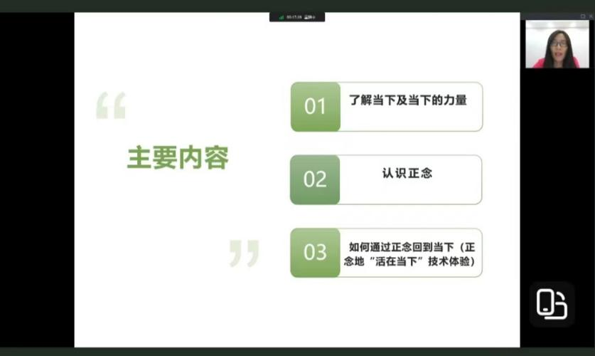 6月1日16:30,由心理發展與服務中心主辦、化工院承辦的陽光“心”成長系列講座第二期在釘釘直播平臺成功舉辦。本次活動邀請到國家二級心理咨詢師、心理發展與服務中心專職教師梁麗老師作為主講嘉賓,累計300余名本科生和研究生參與。本期講座的主題為: 當下即自由——體驗正念心理陪伴,目的是引導同學們進行正念練習,疏解同學們的焦慮情緒,幫助同學們運用“正念”讓自己更好的存在于當下。 “正如《當下的力量》作者埃克哈特說:‘人們之所以感到痛苦,主要原因是大腦被負面思維控制著。’因為在這種思維的影響下,我們容易對過去與未來產生焦慮感,從而就很難把握當下。”梁麗老師通過小游戲引入當下的概念,為同學們解開了關于活在當下的迷思并深入分析了人類面對負面情緒的慣性反應,啟發同學們要化解負面情緒關鍵是要改變我們面對情緒時的習慣性反應,而不是同我們的情緒進行無畏的抗爭。在互動環節中梁麗老師通過小游戲介紹了大腦如何對情緒進行控制并逐步深入揭示了怎樣了解當下及當下的力量,認識正念,以及如何通過正念活在當下。 本次講座的最后,梁麗老師帶領同學們開展了正念冥想力經典方法的訓練。同學們紛紛表示受益匪淺,在直播評論區積極互動,表明了自己的學習期待,能夠學以致用讓正念方法打破悲傷的慣性情緒。至此,陽光“心”成長系列講座第二期圓滿結束。 圖文/林娜 審核/宋姝蕾