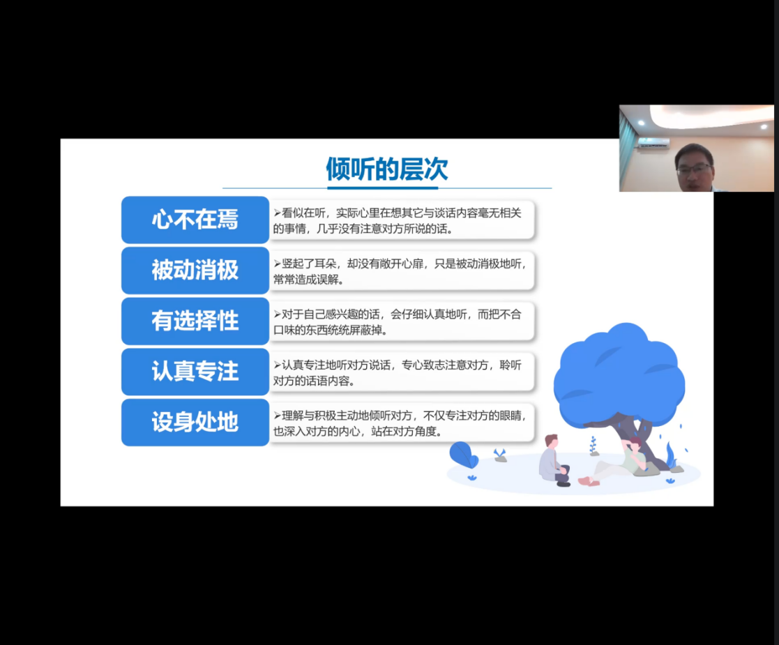 圖2 余強老師講解傾聽的層次 上一條:化工院開展“文明化工,綠色離校”線上環保知識競賽活動 下一條:陽光“心”成長系列講座第二期:當下即自由——體驗正念心理陪伴順利開講 【關閉】 |