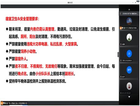 為促進我院研究生的全面發展,使同學們堅定自己未來的發展方向,合理規劃自己未來的人生,化工院于12月24日晚,線上開展2019級研究生期末年級大會。化工院2019級全體研究生參與本次會議,輔導員周廣恒擔任主講人。 大會初始,周廣恒老師播放《初心之路-周永開》視頻,與同學們一起學習周永開先進事跡。年級大會主要從防疫要求,考試誠信,安全管理及假期安排四個部分展開講解。周廣恒老師指出,疫情當下,要以個人安全為重,請假離校要履行相關手續。此外,臨近考試月,全體考生要做到誠信考試,杜絕作弊現象,同時也提醒大家提前安排好假期時間,按流程履行離校或延遲離校相關手續。 講座最后,周廣恒老師激勵同學們提前做好未來規劃,合理樹立每個小階段的目標,腳踏實地完成自己的學業,實現自己的夢想。 (文/陳晗鈺 圖/宋儒霞) (審核:周廣恒)