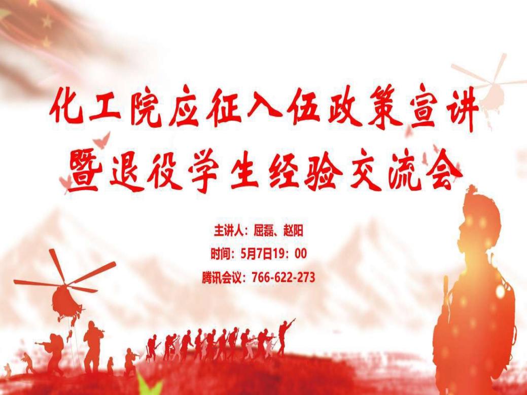 矢志軍營,迷彩青春——化工院開展應(yīng)征入伍政策 宣講暨退伍學(xué)生經(jīng)驗(yàn)交流會(huì)2022-05-10 作者:孫圻、曹雙燕 編輯:楊磊 審核:陳剛 瀏覽:[]
