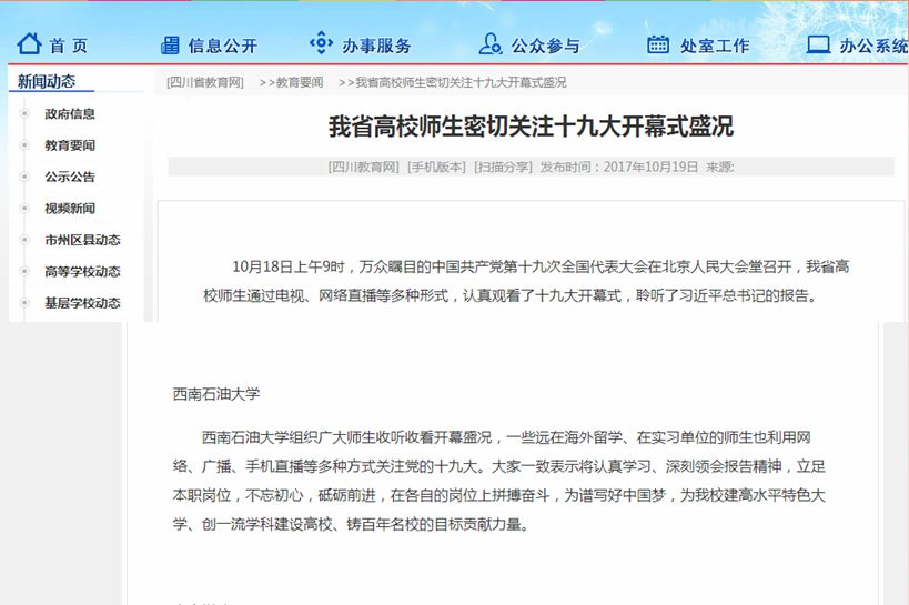 報(bào)道說,十九大開幕當(dāng)天,西南石油大學(xué)組織廣大師生收聽收看開幕盛況,一些遠(yuǎn)在海外留學(xué)、在實(shí)習(xí)單位的師生也利用網(wǎng)絡(luò)、廣播、手機(jī)直播等多種方式關(guān)注黨的十九大。大家一致表示將認(rèn)真學(xué)習(xí)、深刻領(lǐng)會報(bào)告精神,立足本職崗位,不忘初心,砥礪前進(jìn),在各自的崗位上拼搏奮斗,為譜寫好中國夢,為學(xué)校建高水平特色大學(xué)、創(chuàng)一流學(xué)科建設(shè)高校、鑄百年名校的目標(biāo)貢獻(xiàn)力量。