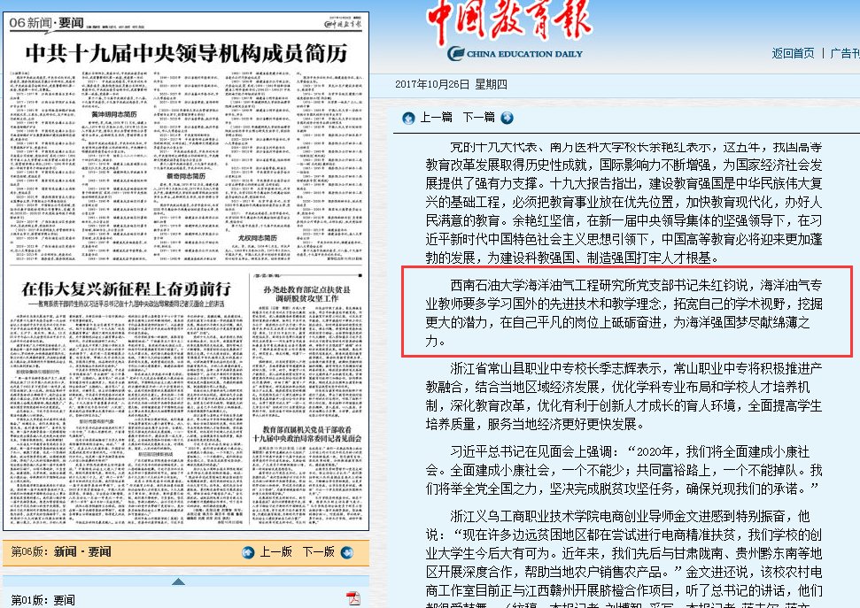 報(bào)道特別提到了遠(yuǎn)在澳大利亞西澳大學(xué)訪學(xué)的西南石油大學(xué)石工院海洋油氣工程研究所黨支部書記朱紅鈞,與幾名留學(xué)生通過網(wǎng)絡(luò)收看十九大開幕式。朱紅鈞說,雖然身在國外,但他沒有任何一個時刻像此時這么強(qiáng)烈地心系祖國。