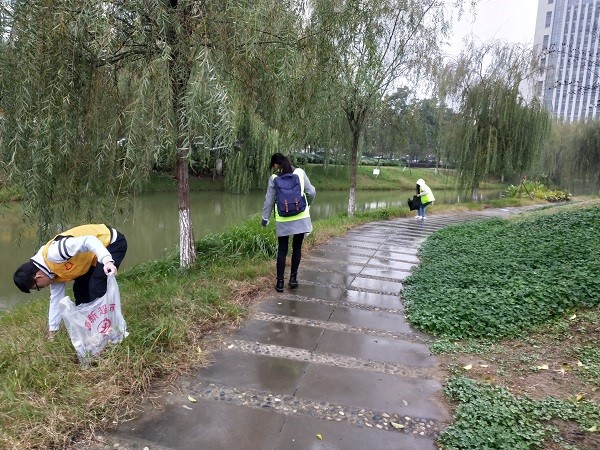 活動開始前,負責人便早早地來到1期籃球場外等候志愿者們,組織簽到及對大家進行活動分工。活動開始后,志愿者們兵分兩路,沿著夢溪湖畔進行清掃。活動過程中,志愿者們戴著手套,彎腰從草叢中撿起那一片片刺目的白色垃圾。盡管天公不作美,不一會兒天空下起了料峭寒雨,但是這并沒有澆滅志愿者們的熱情,反而他們撐起自己的雨傘或戴著帽子在自己負責的區域內辛勤地工作著。終于功夫不負苦心人,通過志愿者的共同努力,林間小道、草坪深處均已不見塑料袋、煙頭紙屑。志愿者們用自己的一份努力為學校增添了一抹明亮,讓清幽寧靜的夢溪湖變得更加美麗。