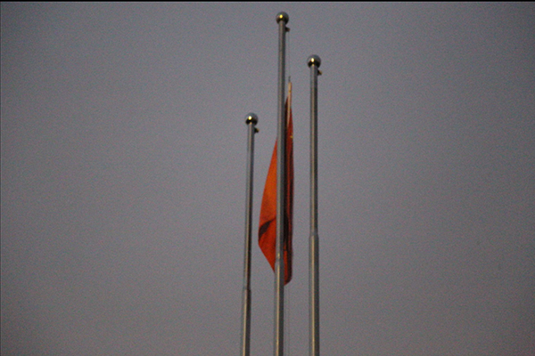6:50分,升旗儀式正式開始。升旗儀式第一項——奏國歌升國旗。只見國旗護衛隊踏著整齊的步伐,向國旗邁進。國旗隨著音樂緩緩升起,同學們的目光交匯在國旗上,好似看到一個光明的前程。