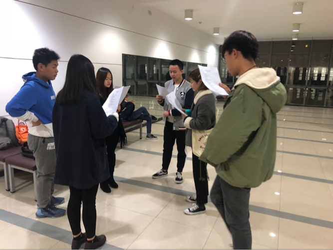 寒風(fēng)吹細(xì)雨,這冰冷的夜凍不了我們的熱情。今晚八點(diǎn)四十,在明志樓的大廳,部長們陪同演員們一起積極準(zhǔn)備團(tuán)會表演。