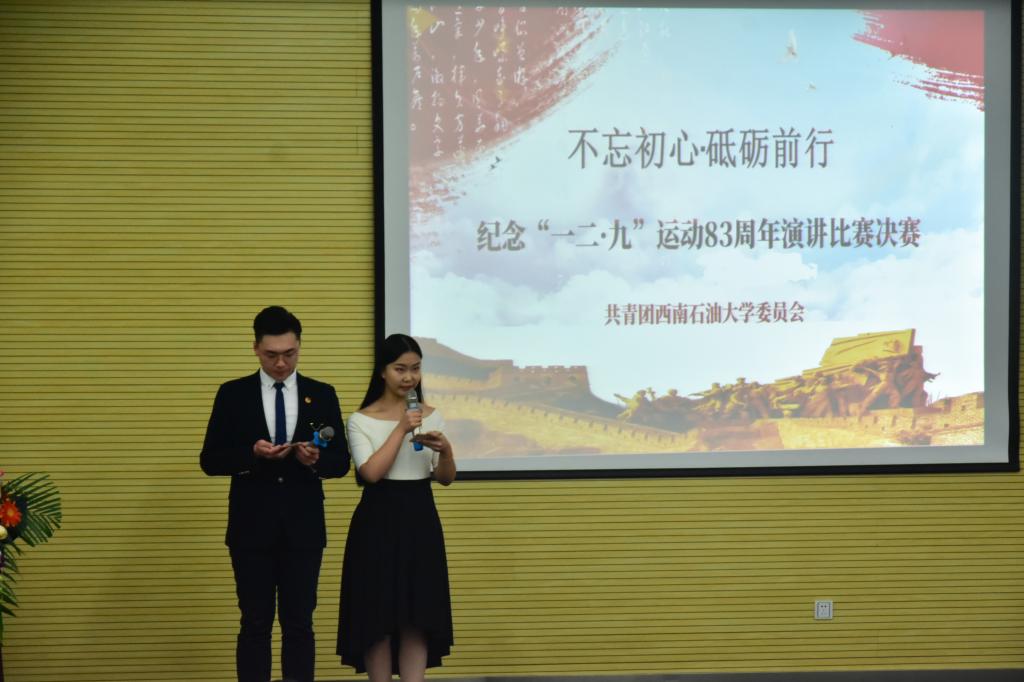 為紀念一二·九愛國運動83周年,2018年12月9日晚七點“一二·九”運動演講比賽于明志樓B 105舉行。西南石油大學宣傳部副部長牟卿老師、學工部副部長陳利宏老師、藝術學院播音教研室主任、王煒老師以及西南石油大學校團委副書記張維老師參加活動并擔任評委。