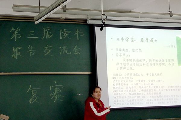 本次復(fù)賽所采取的形式為選手根據(jù)自己所講內(nèi)容主題制作 PPT進(jìn)行演講,演講時(shí)間為8—10分鐘。我院選手代繼樑同學(xué)分享的書(shū)籍為《文化苦旅》,在他的分享中,評(píng)委和同學(xué)們感受到了余秋雨先生筆下的這本書(shū)并不是在欣賞山水風(fēng)景,而是在對(duì)歷史的滄桑的一種回顧,嘆息和哀傷,也是對(duì)人生的一種激勵(lì)。一次次的漂泊旅程,都是在增長(zhǎng)我們的智慧,洗滌著我們的心靈;蒲凱倫同學(xué)分享的《平常茶,非常道》讓聽(tīng)眾們感受到了林清玄所描繪的“茶能生善,茶可洗心。”的精神境界;徐建同學(xué)分享了我校學(xué)生借閱率最高的書(shū)——《平凡的世界》,在他口中為大家展現(xiàn)了那個(gè)年代的勞動(dòng)與愛(ài)情,挫折與追求,痛苦與歡樂(lè),讓同學(xué)們懂得平凡才是偉大的真理;王昆鵬同學(xué)為大家?guī)?lái)了《喬布斯傳》,為同學(xué)們展示了喬布斯生前堅(jiān)定的信仰和非凡的“蘋(píng)果”。