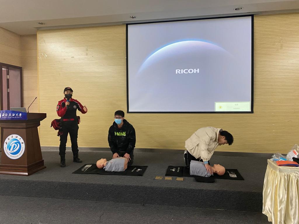 此次講座采用PPT教學和現場實訓相結合的方式,來幫助同學們更好地學習實驗室安全知識。首先,丁睿老師從用電安全、用水安全、化學品安全和用氣安全四個方面對實驗室存在的各種安全問題以及相關的應對措施進行了細致的講解,同時結合多個真實的實驗室安全事故案例,讓同學們對實驗室安全問題有了更進一步的了解。接著老師們為每位同學發放了急救知識培訓材料包,詳細的向同學們介紹了基礎急救知識并演示了每種急救材料的使用方法。最后,講解老師利用模擬人偶演示了心肺復蘇的操作流程,包括判斷意識、胸外按壓、人工呼吸等內容。同學們也積極踴躍上臺,在講解老師的指導下依次體驗胸外按壓和AED除顫儀的實際操作,講解老師就同學們的各種錯誤,如急救操作前周圍環境的判斷、胸外按壓的位置和速度等細節問題進行了及時糾正。現場的學習氛圍積極熱烈,同學們學習效果顯著。