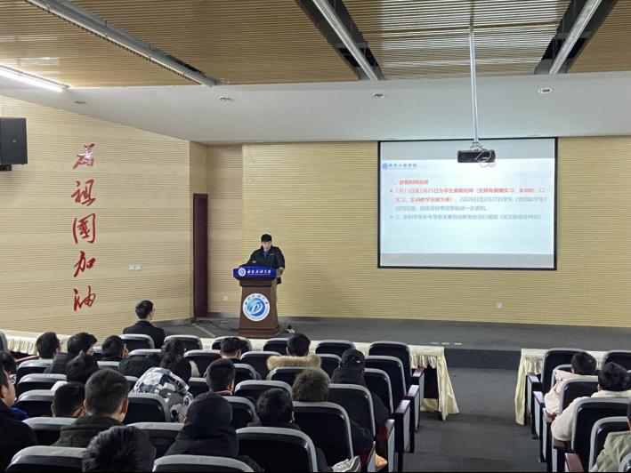 會上夏老師分別強調了以下幾點:1、寒假放假時間以及期末考試安排,提醒大家注意防火防盜防詐騙,出行注意安全,遵紀守法。2、對于有特殊原因不回家或者晚回家的同學須要辦理留校手續,在校遵紀守法,嚴禁違反相關規定;3、注意選課;4、誠信應考;5、基于寢室防火安全等。學校后勤服務總公司學生公寓管理中心將根據假期離校、留校登記情況,對寒假期間全員離校的學生寢室實行斷電和貼封處理。學生因開學補考等原因提前返校的,必須在本樓門衛處登記才能恢復寢室供電。