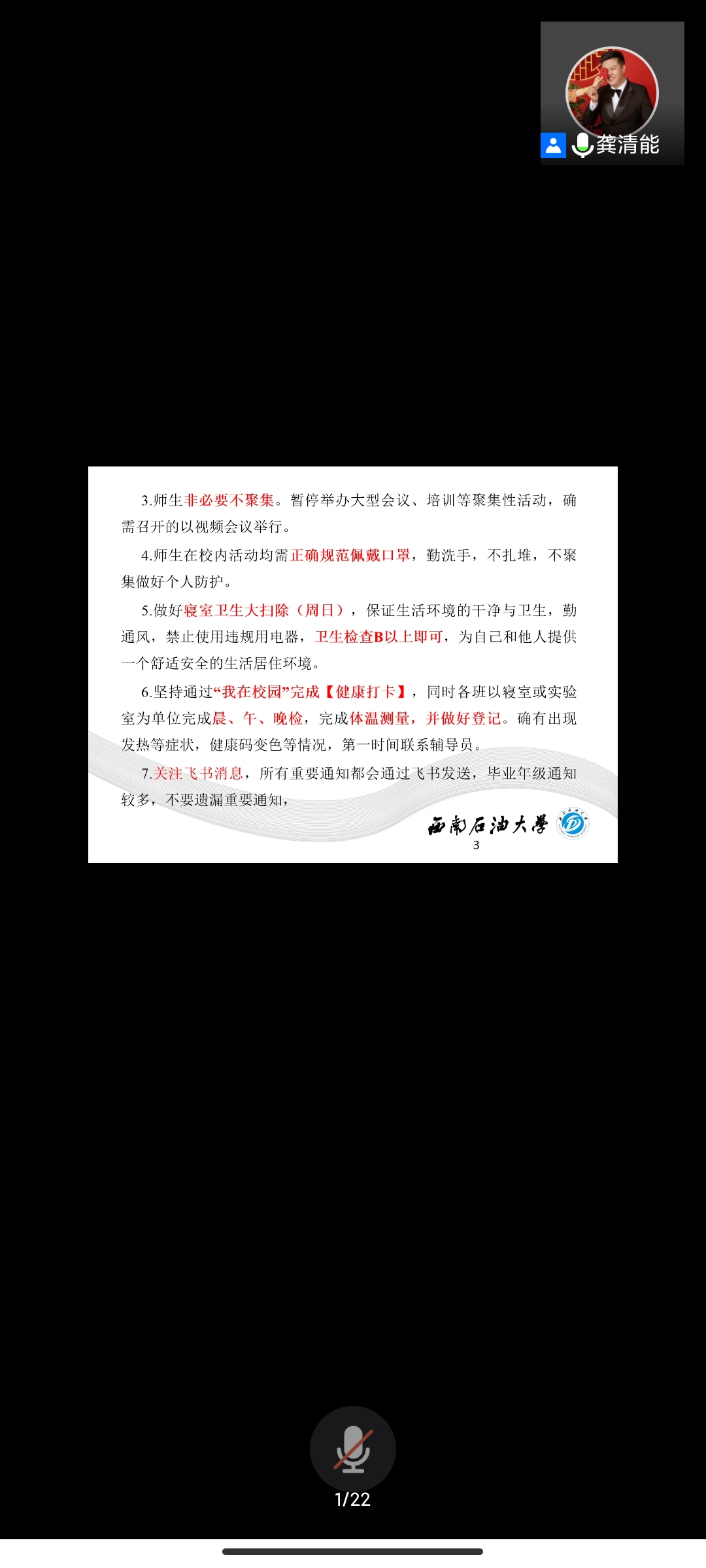 龔清能老師就疫情期間在校行為規(guī)范方面做了嚴(yán)格的要求,所有同學(xué)嚴(yán)禁無故離校,離校必須嚴(yán)格履行請假手續(xù),如果出現(xiàn)發(fā)熱、咳嗽等癥狀,第一時(shí)間就醫(yī)并向輔導(dǎo)員老師報(bào)備。強(qiáng)調(diào)學(xué)生非必要不外出、非必要不聚集,減少接觸,正確佩戴口罩,做好個(gè)人防護(hù)。每天堅(jiān)持健康打卡,完成體溫監(jiān)測。
