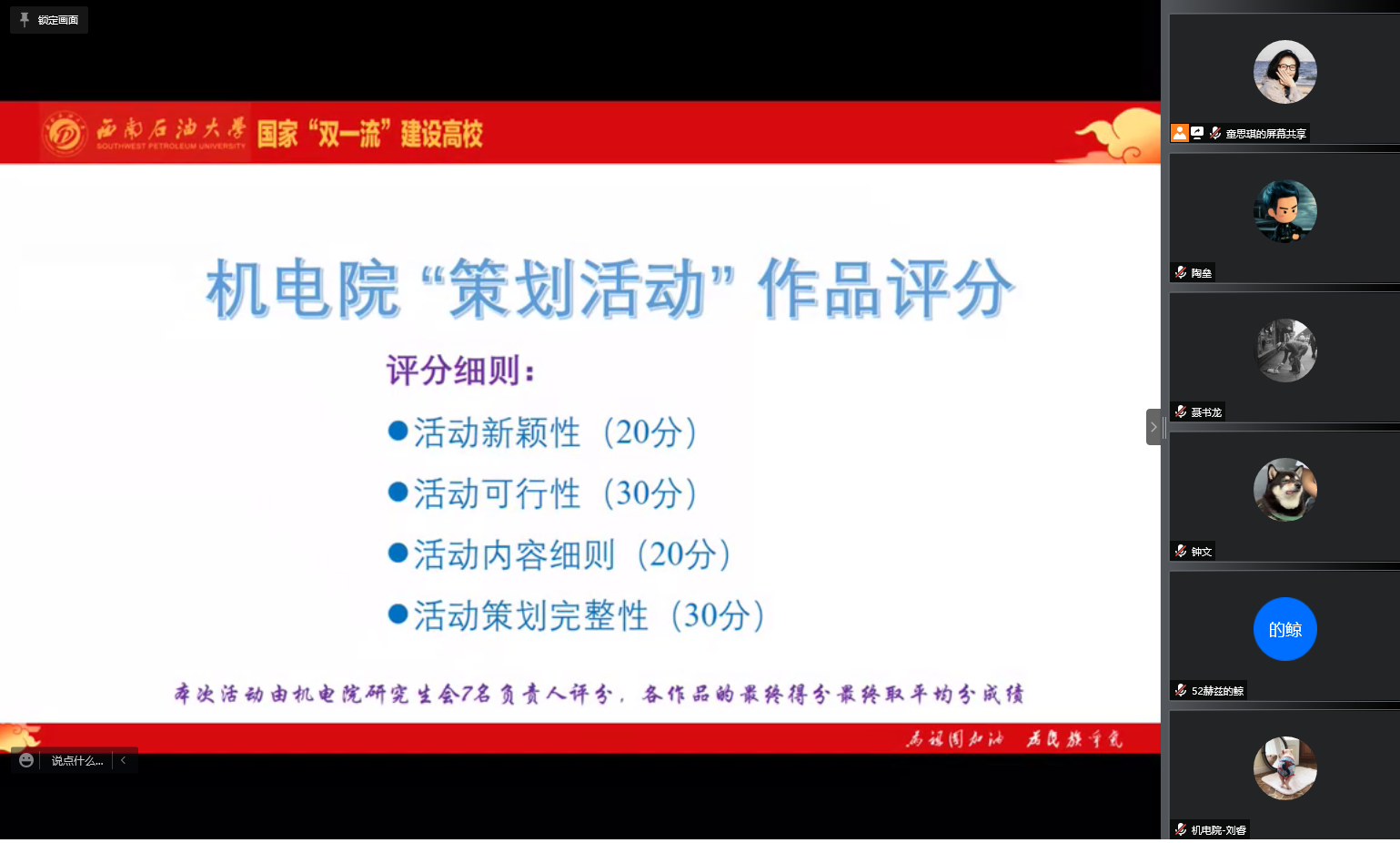 2022年3月10日,西南石油大學機電院研究生會完成了“眾志成城謀策劃,集思廣益創佳績”策劃書比賽活動的線上評選工作,此次活動以加強學生的文化修養,提高學生的開拓創新能力,促進學生的健康成長為目的,活動從幾十份參賽作品里評選出了6份優秀的作品。