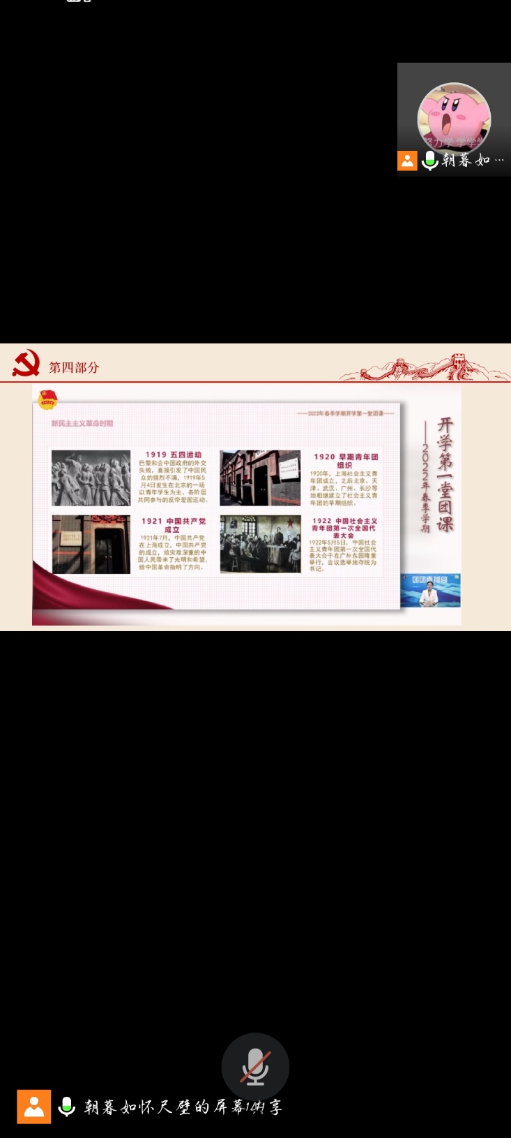 第四部分,為觀看“2022年春季學期的開學第一堂團課”視頻,借此我們又深刻的了解了1919年的五四運動,1920年早期青年團組織,1921年中國共產黨成立,1922中國社會主義青年團第一次全國代表大會等等知識,增深了對青年團組織的認知,也堅定了黨的不可動搖的地位。