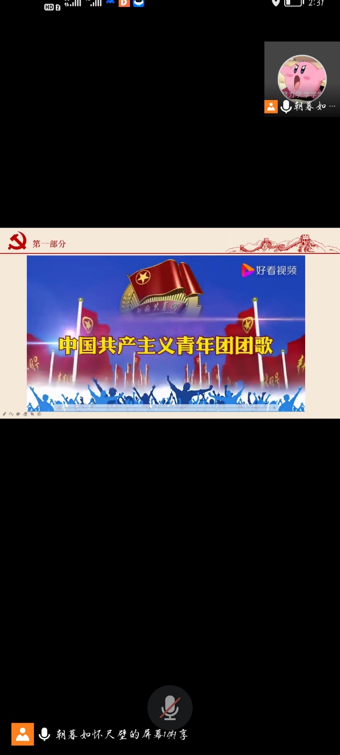 本次團組織生活主要分為五部分組成,首先第一部分為全體共唱《中國共產主義青年團團歌》,在視頻的指引下,同學們共同默默跟唱,在心中與祖國共鳴!