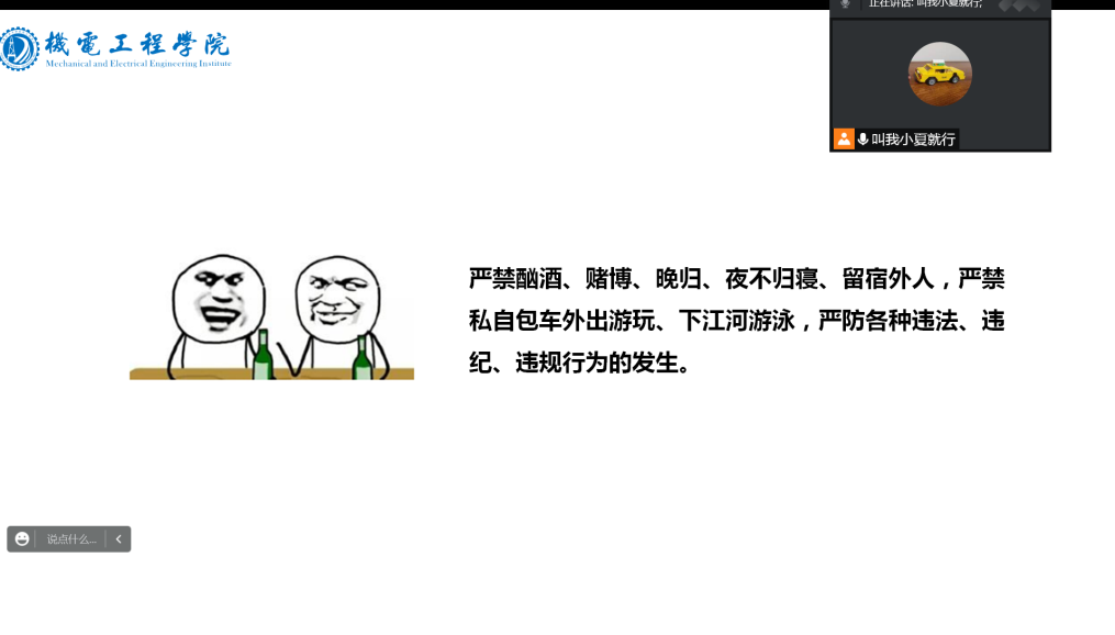 6月12日12:40,機械類2021級在線上召開本學期期末年級大會,布置暑假事宜。大會由輔導員夏天鴻老師主持召開。