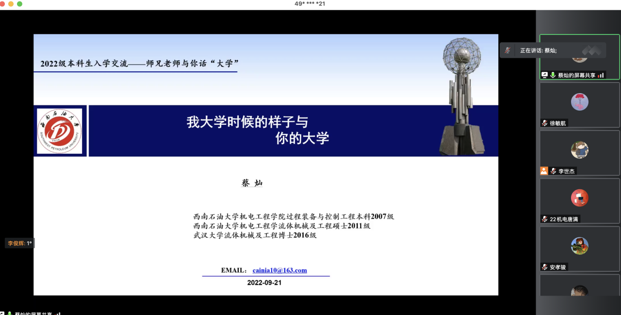 蔡燦老師本碩均畢業于本校,作為同學們的師兄師姐,他先向同學們表達了熱烈的歡迎之情,也向同學們介紹了自己在校期間學習和生活情況。同時蔡老師結合自己的成長生活經歷告誡2022級新同學們一定要在現在越加優越的教學環境和教學條件里把握學習機會,多多提高自己,不要荒廢自己的大學生活。