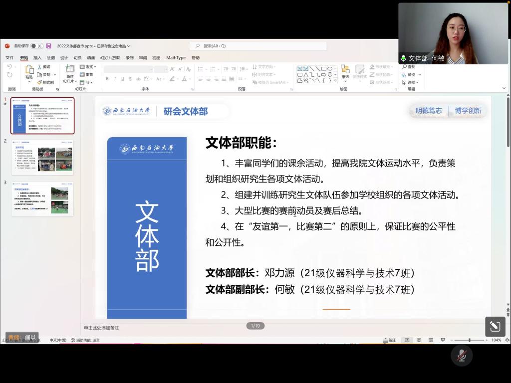 萬季澤還介紹了研究生會的組織架構(gòu),主要由辦公室、學(xué)科部、傳媒部、文體部和生活部組成。此后,每個部門的負責人對各自部門的職能,往年活動和招新要求都進行了詳細介紹。最后萬季澤總結(jié)了本次研究生會的招新計劃,向大家展示了報名途徑和參與方式。