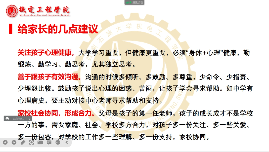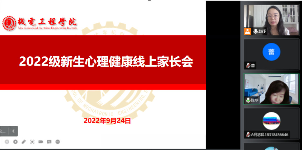 為了有效推進學生心理健康教育工作,家校聯動形成育人合力,2022年9月24日下午,機電工程學院召開2022級心理健康線上家長會。學院心理輔導員趙抒與2022屆本科新生家長進行了溝通交流。