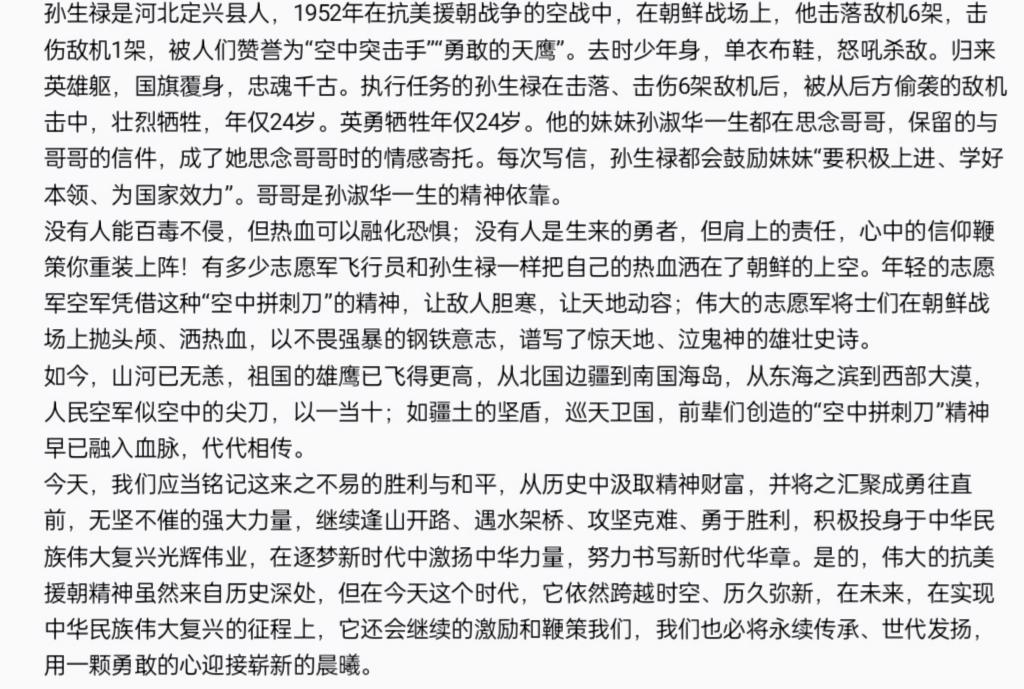 4月5日晚,機電工程學院實踐部組織并開展了“清明祭英烈”線上觀影活動。活動伊始,主持人介紹了本次活動流程并播放紀錄片《軍事紀實》。影片講述了在抗美援朝時期,“一級戰斗英雄”孫生祿烈士為保家衛國先后擊落了美軍敵機6架,擊傷1架,在與數倍于己的敵機作戰中,英勇犧牲的英雄事跡。觀影過程中,同學們無不為影片中孫生祿烈士傲人的功績而振奮,為孫生祿烈士的犧牲而惋惜。觀影結束后,同學們認真地記錄下自己的所觀所感所思,以此來表達他們對于先烈的贊美與緬懷。
