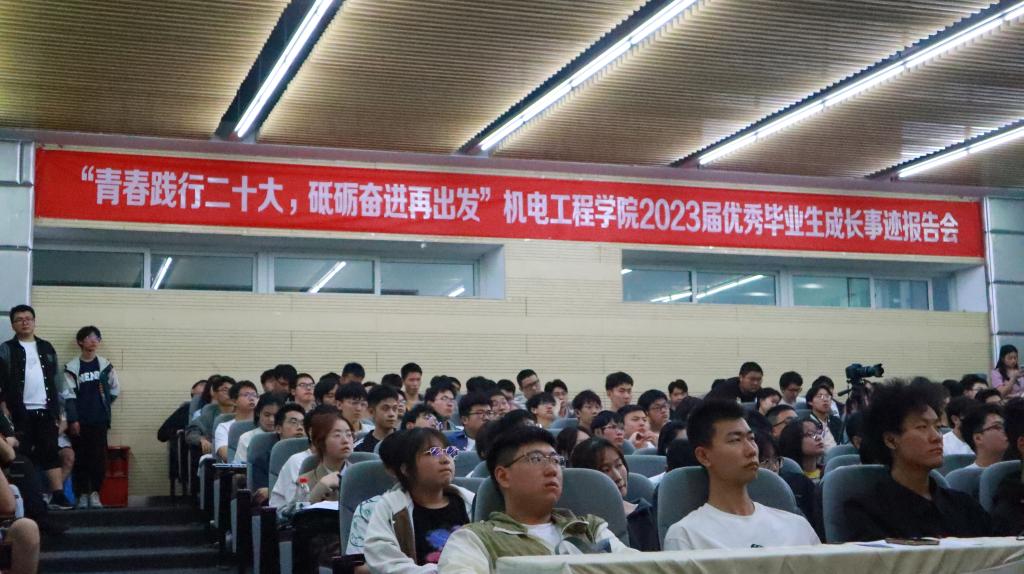 為深入學習貫徹黨的二十大精神,更好地展現我院2023屆優秀畢業生的風采。4月27日19點,機電工程學院于明志樓B105學術報告廳舉辦了“青春踐行二十大,砥礪奮進再出發”2023屆優秀畢業生成長事跡報告會。9名優秀畢業生代表分享了他們的青春奮進故事。畢業班輔導員袁玥、龔清能、譚翔、魏文和學院低年級200余名參加此次報告會。