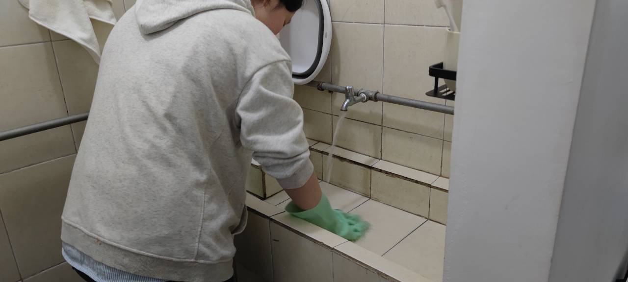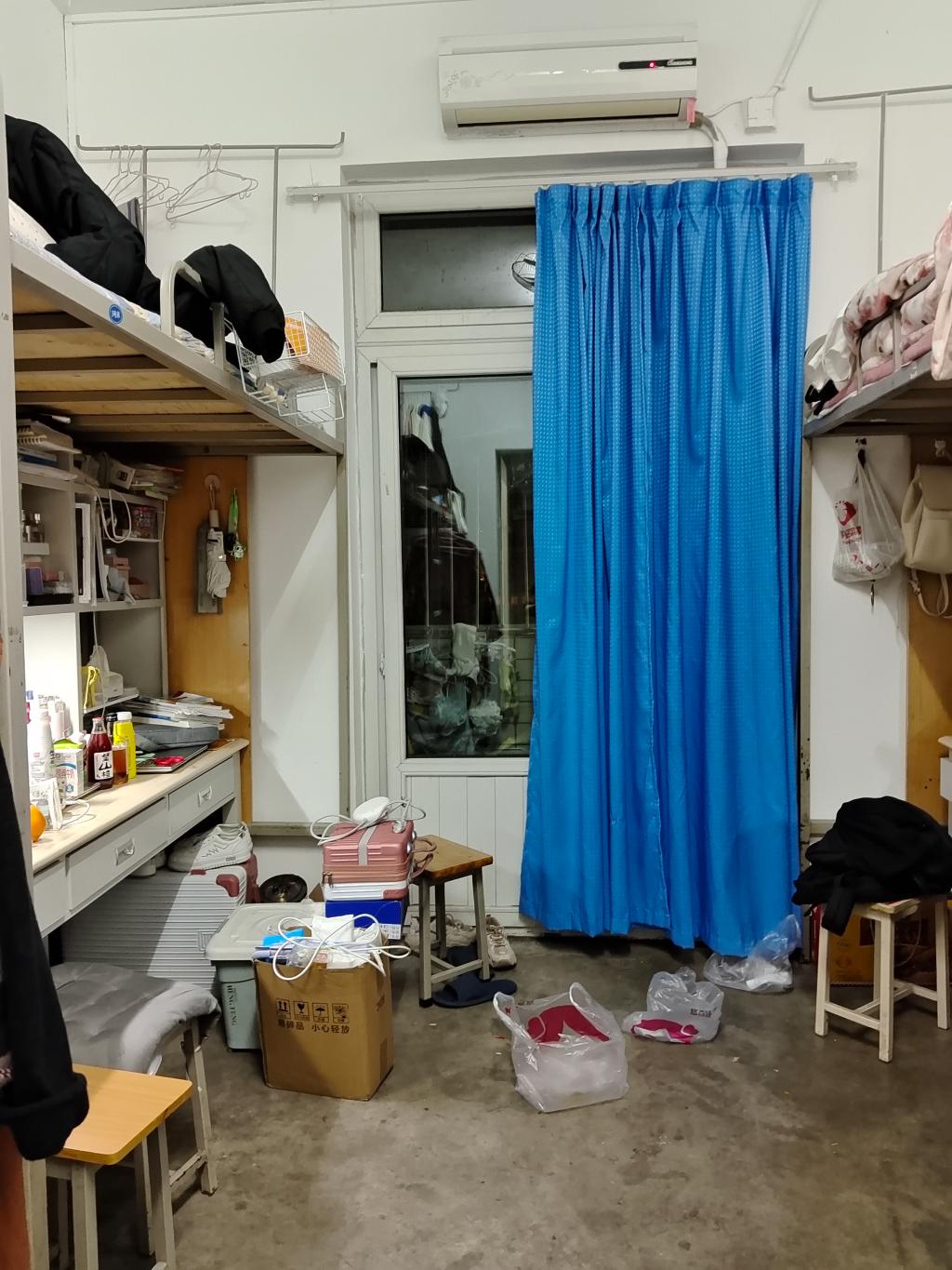 寢室水泥地裸露,房間收納空間有限,物品堆放較為雜亂