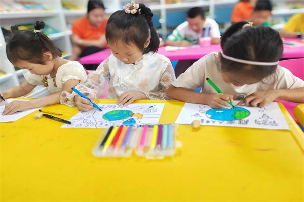 早上九點,公益課堂正式開始。首先,授課隊員通過互動和案例分享向小朋友們生動地解釋水資源的稀缺性,從而引發他們對于節約用水的思考,讓他們從小便認識到每一滴水的珍貴。之后,授課隊員還邀請小朋友們分享日常生活中節水的小竅門,讓小朋友們能了解更多的節水小知識。接下來開展的是以節約用水為主題的創意繪畫環節。小朋友用他們雙手繪制地球水資源干枯的情景。在他們筆下,“干涸地球”的圖畫呈現的栩栩如生,小朋友們還在畫紙上寫下“節約用水,人人有責”六個大字。在課間休息時,隊員帶領小朋友們來到室外玩他們喜歡的“木頭人”和“鯊魚鯊魚幾點了”兩個游戲。小朋友們十分喜歡這樣的游戲,在歡聲笑語中度過了美妙的戶外時光。隨后,實踐隊隊員接續昨日環保的主題,讓小朋友利用廢棄的塑料瓶蓋制作熱氣球屋。小朋友們在實踐隊隊員的幫助下對廢品進行二次創作,讓塑料瓶蓋成為天空輕盈漂浮的氣球,最終制作成美麗小飛屋。